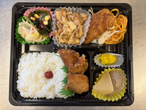 唐揚げや生姜焼き、とんかつが入ったちょっとした会食やホームパーティにも嬉しいお子様ランチのようなお弁当です。